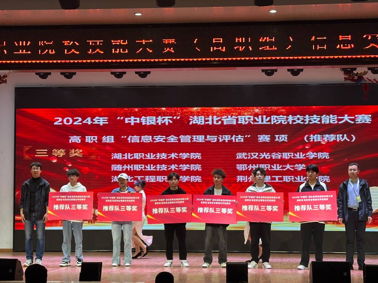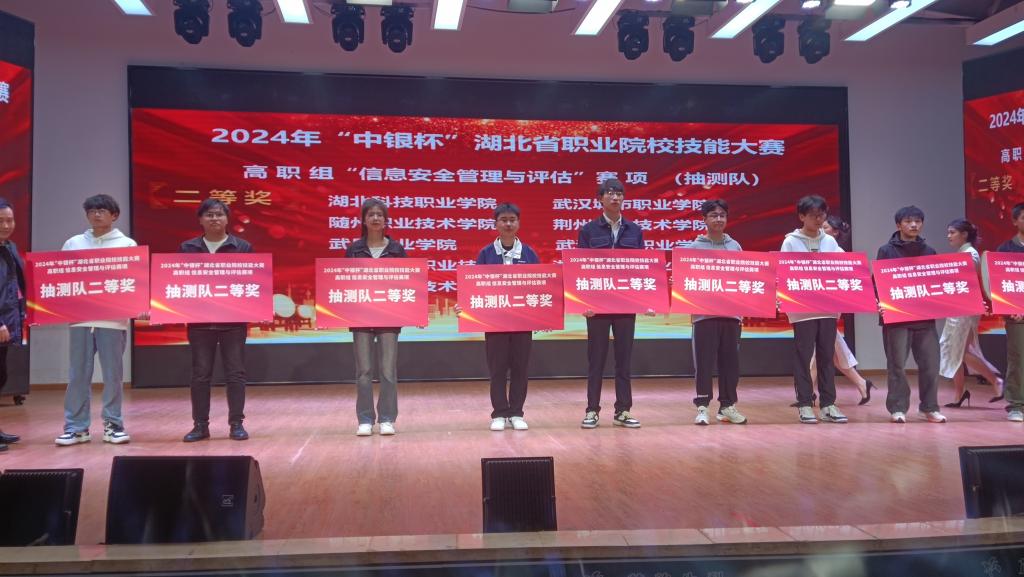 2024年湖北省职业院校技能大赛(高职组)“信息安全管理与评估”赛项 ,我院学生夏旺、杨佳欣、彭子健组成的团队获得推荐组三等奖,周欣垚、蒋苏亚、王羊组成的团队获得抽测组二等奖,李盛老师获得教师组三等奖