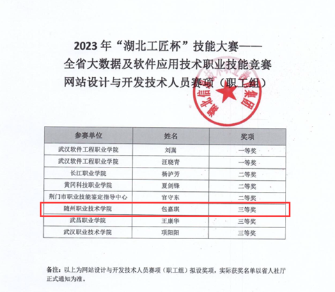 我院教师包嘉琪获得2023 年“湖北工匠杯”技能大赛——全省大数据及软件应用技术职业技能竞赛网站设计与开发技术人员赛项三等奖
