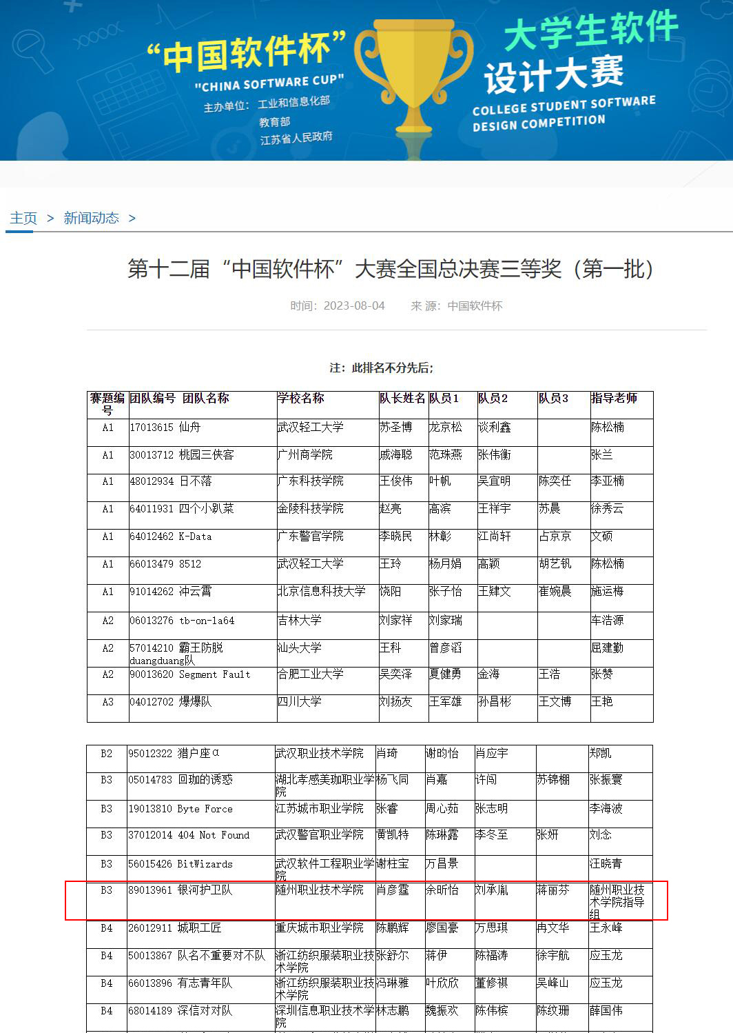 2023年,信息工程学院学生余昕怡、肖彦霆、刘承胤、蒋丽芬组成的团队荣获第十二届“中国软件杯”大学生软件设计大赛全国总决赛三等奖