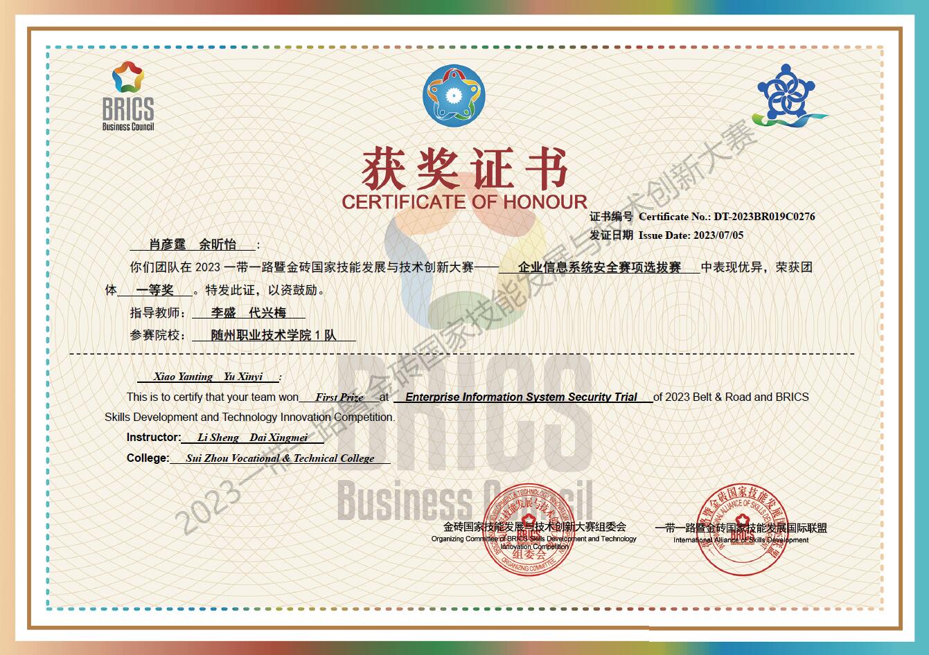 2023年,我院学生余昕怡、肖彦霆组成的团队获得一带一路暨金砖国家技能发展与技术创新大赛之企业信息系统安全选拔赛一等奖