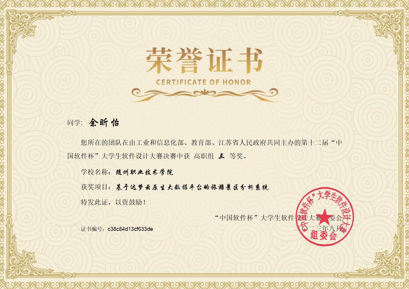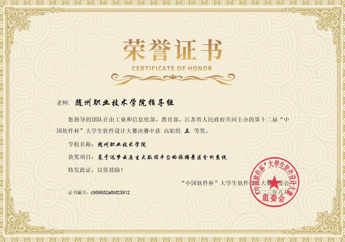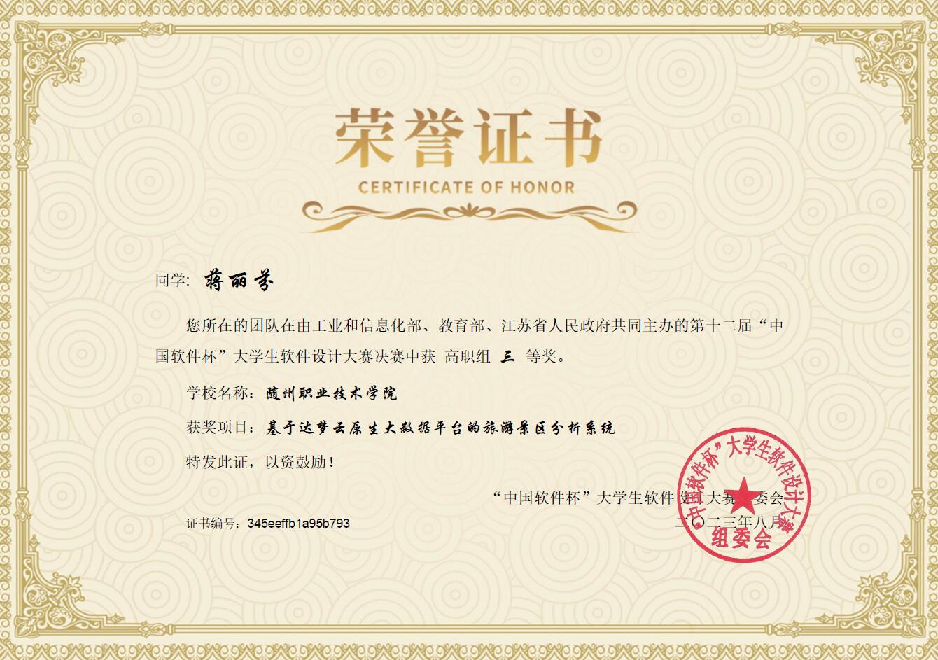 2023年,我院学生肖彦霆、余昕怡、刘承胤、蒋丽芬获得第十二届“中国软件杯”大学生软件设计大赛全国总决赛三等奖。