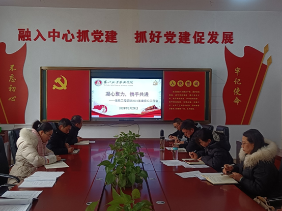 龙行龘龘新学期 砥砺前行谱新篇。2月29日下午,信息工程学院召开2024年春学期开学工作会议暨政治理论学习会议,会议由党总支书记、院长张宝华主持。计算机教研室、电子教研室、教学与科研办公室、学生工作办公室负责人就新学期各项工作作了具体部署,党总支副书记周俊、副院长李娟就学生管理、教学工作提出了相关要求。