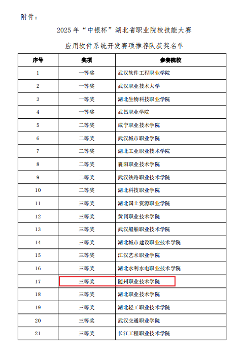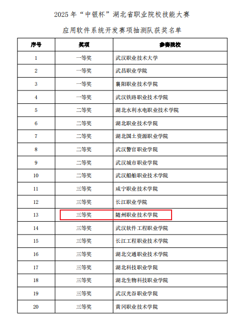 7月5日,在武汉软件工程职业学院举办的2025年“中银杯”湖北省职业院校技能大赛(高职组)应用软件系统开发赛项中,随州职业技术学院信息工程学院由徐昊祥、姚楠、倪诗豪三名同学组成的推荐组,以及由范斌、白欢悦、黎文睿三名同学组成的抽测组,均获得大赛三等奖。此成绩充分展现了随州职业技术学院在应用软件技术人才培养方面的显著成效和师生精湛的技术技能水平。