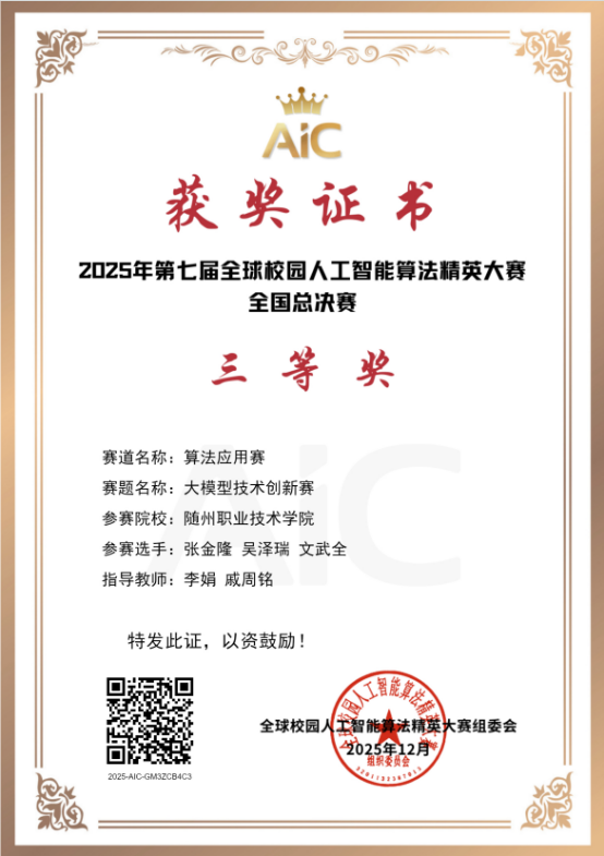 在刚刚结束的2025年第七届全球校园人工智能算法精英大赛全国总决赛上,信息工程学院学生张金隆、吴泽瑞、文武全三位同学组成的团队,凭借出色的专业能力和稳定的临场发挥,最终荣获全国总决赛三等奖。