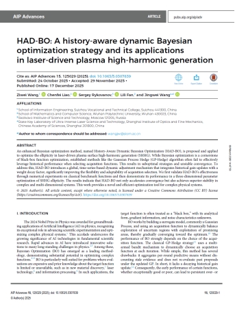 深耕科研,初露锋芒。作为一名刚踏上三尺讲台的新教师,王子威老师在完成日常教学和班级管理工作的同时,始终坚持“以研促教”。他聚焦人工智能优化算法方向,以第一作者在SCI(科学引文索引)收录期刊《AIP Advances》上发表了题为《HAD-BO: A history-aware dynamic Bayesian optimization strategy and its applications in laser-driven plasma high-harmonic generation》的研究论文。该研究提出了“历史感知的动态贝叶斯优化策略”,为激光等离子体参数优化提供了新思路,展现了人工智能与工程应用交叉领域的创新潜力。这不仅是我院在人工智能研究方向上的有益积累,也体现了青年教师入职后快速融入科研团队的活力与潜力。
