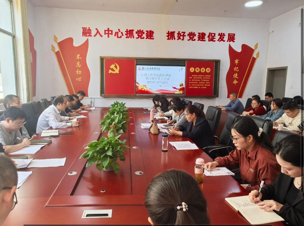 2024年10月18日,信息工程学院党总支书记张宝华同志带领全体教师集中学习《习近平对职业教育工作作出重要指示强调》、《中共中央国务院关于弘扬教育家精神加强新时代高素质专业化教师队伍建设的意见》等文件精神。
