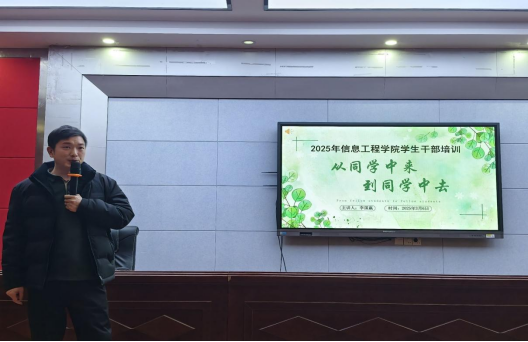 2025年3月6日晚,信息工程学院在学校学术报告厅成功举办了一场以“从同学中来,到同学中去”为主题的学生干部培训会。本次培训会旨在提升学生干部的服务意识与工作能力,促进学生干部更好地融入同学群体,切实为同学们服务。来自各班的班长、劳生委员以及全院149名寝室长共同参与了此次培训。本次培训会由学生工作办公室主任李国赢主讲。