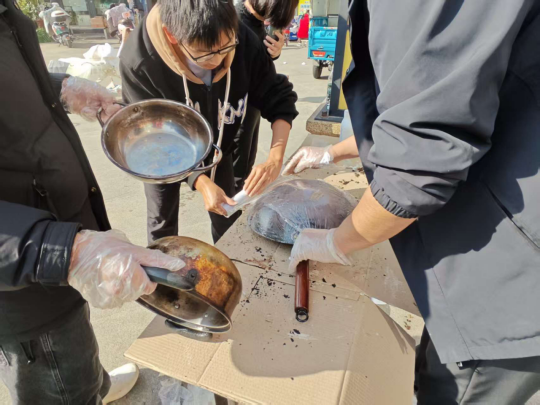2025年11月20日信息工程学院志愿者免费帮居民清理锅底顽固污垢,全程采用“物理预处理+化学清洁+静置生效”的科学流程。