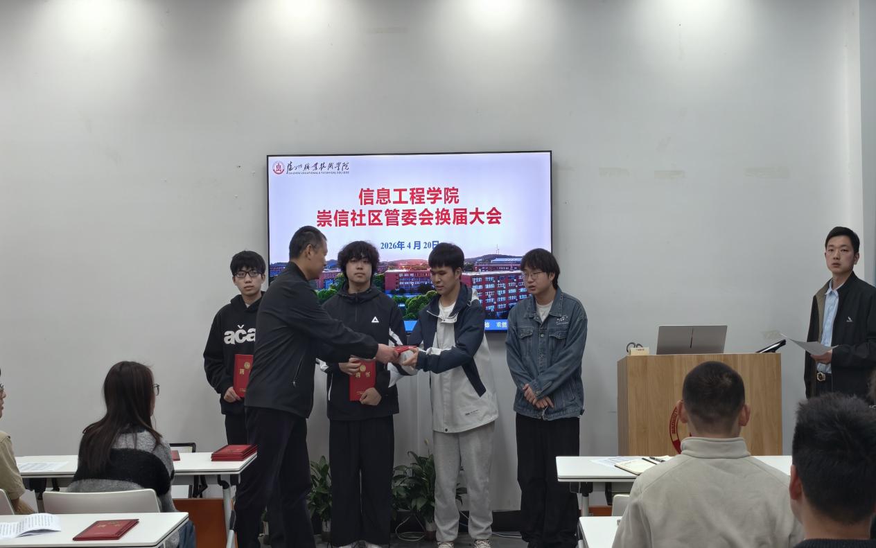 聘书颁发环节紧随其后,信息工程学院党总支副书记吴付勇为新一届管委会成员逐一颁发聘书。一纸聘书,既是信任与嘱托,更是责任与担当,接过聘书的成员们神情庄重,纷纷表态将恪尽职守、不负期望,全力做好社区各项服务工作。